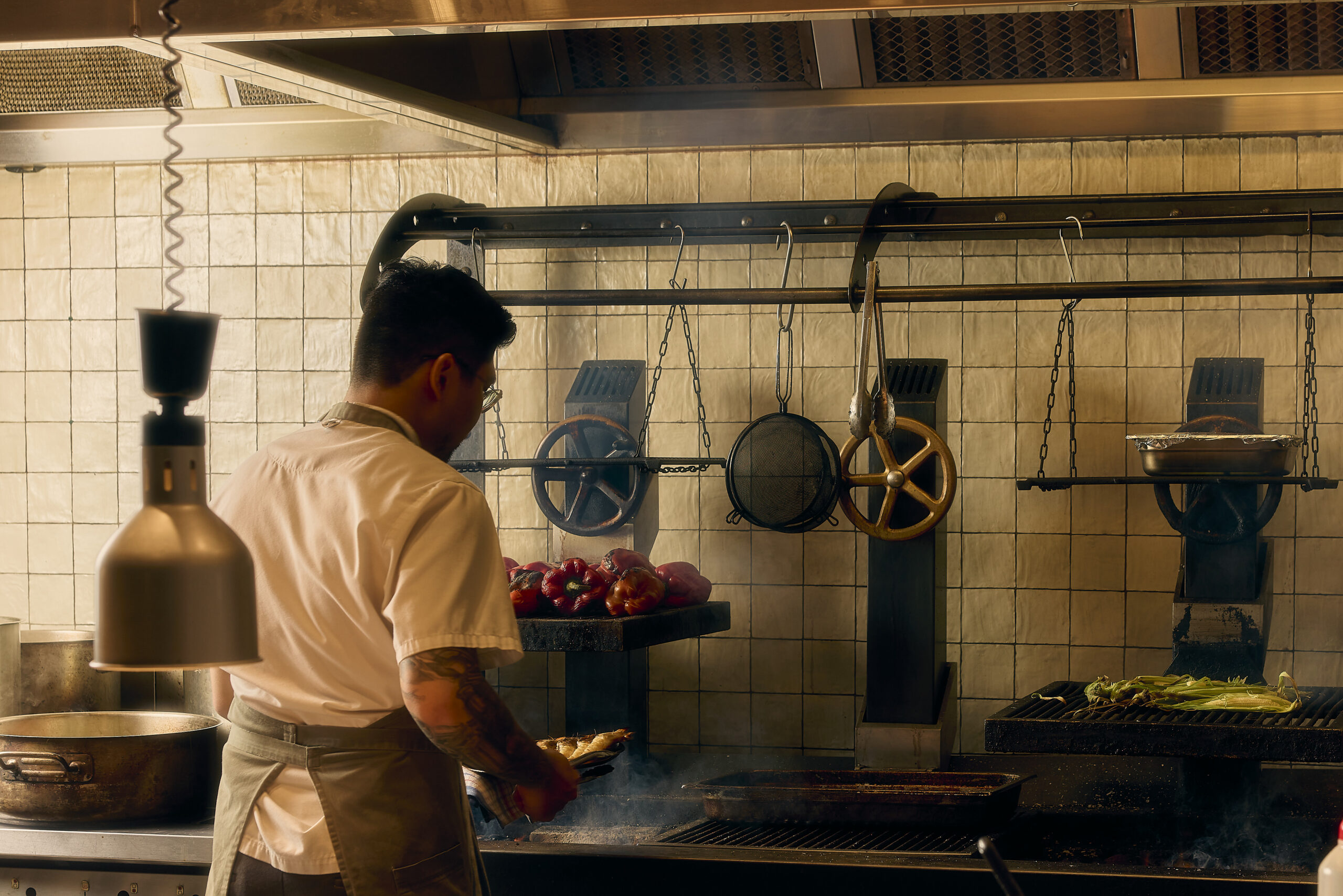 Split over two levels, Hazel has two dining spaces. Upstairs, you’ll find a dining room overlooking the wood-fired grill and smoker that are the heart of Hazel’s open kitchen.